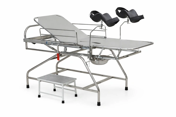 The structure is supported by a robust base frame made of CRCA tubes, ensuring stability and long-lasting performance in demanding healthcare environments. It is also equipped with lithotomy crutches (lithotomy rods) with straps, providing secure leg support during delivery or gynecological procedures.